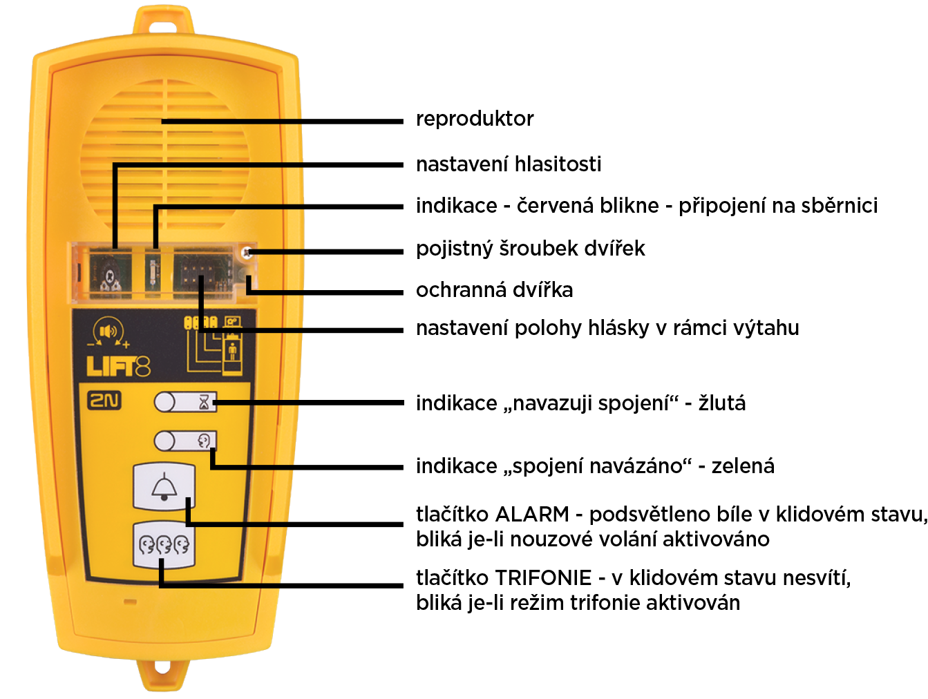 - Tlačítko TRIFONIE aktivuje hlasitou komunikaci s ostatními hláskami téhož výtahu.