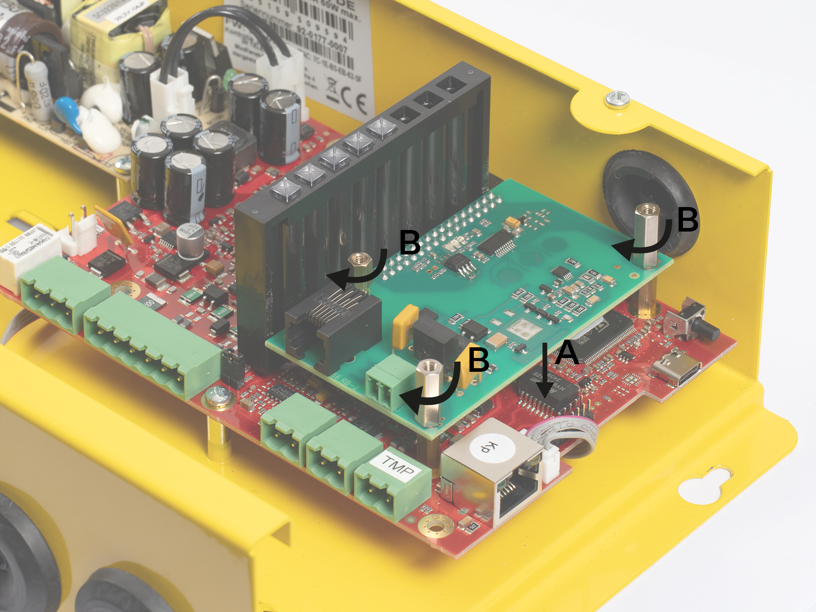 Modul nasaďte na distanční sloupky s vnějším závitem (2) a připojte do konektoru na základní desce (1).