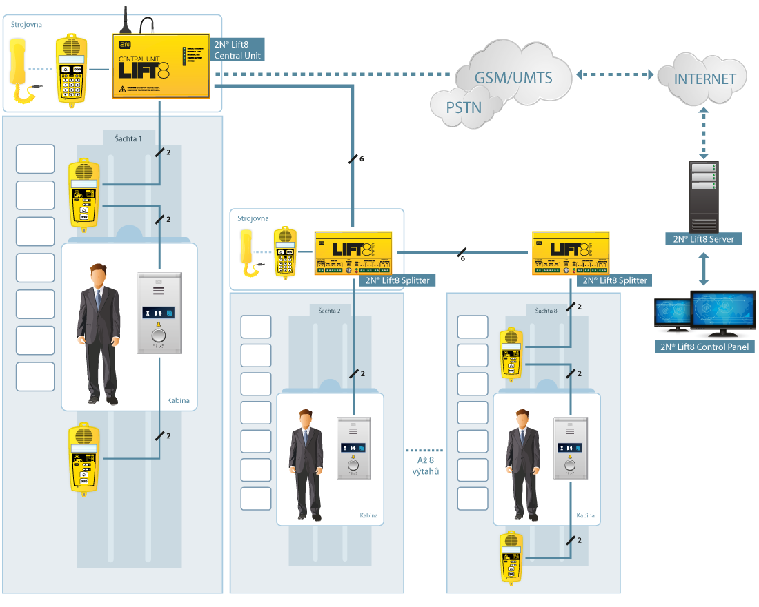 - Možnost připojit až 8 výtahů