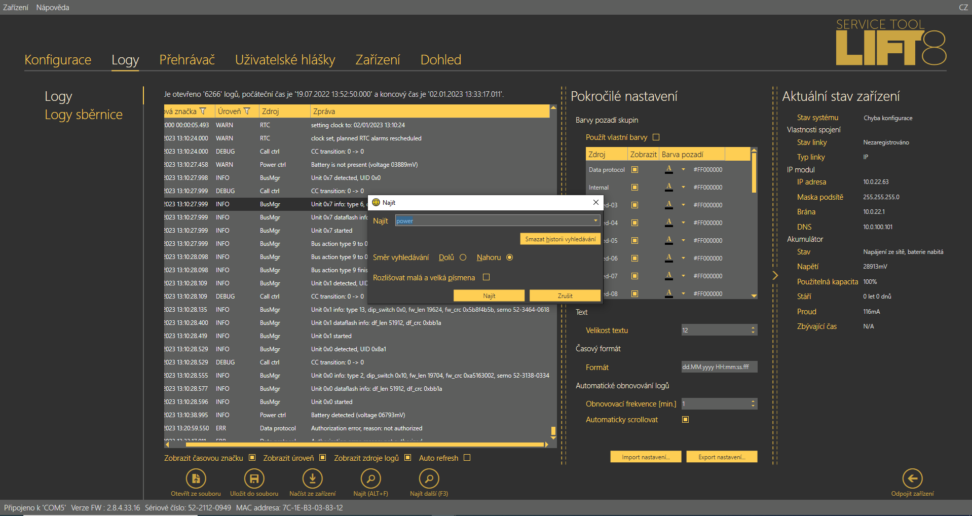 V levé dolní části je možné zachycený log uložit do souboru pro pozdější analýzu. Jestliže potřebujete nalézt v zachyceném logu konkrétní zprávu, použijte tlačítko Najít. Zobrazí se dialogové okno pro zadání vyhledávaného řetězce (slova). Po stisku tlačítka Filtr se najde první výskyt odpovídající zadání. Chcete-li nalézt další výskyt tohoto stringu, použijte tlačítko Najít Další. Pro lepší zobrazení vámi požadovaných logů použijte Pokročilé nastavení, které umožňuje zapínat nebo vypínat jednotlivé typy zpráv a označovat je různými barvami. Nabízí také další možnosti využití. Více se dozvíte níže.