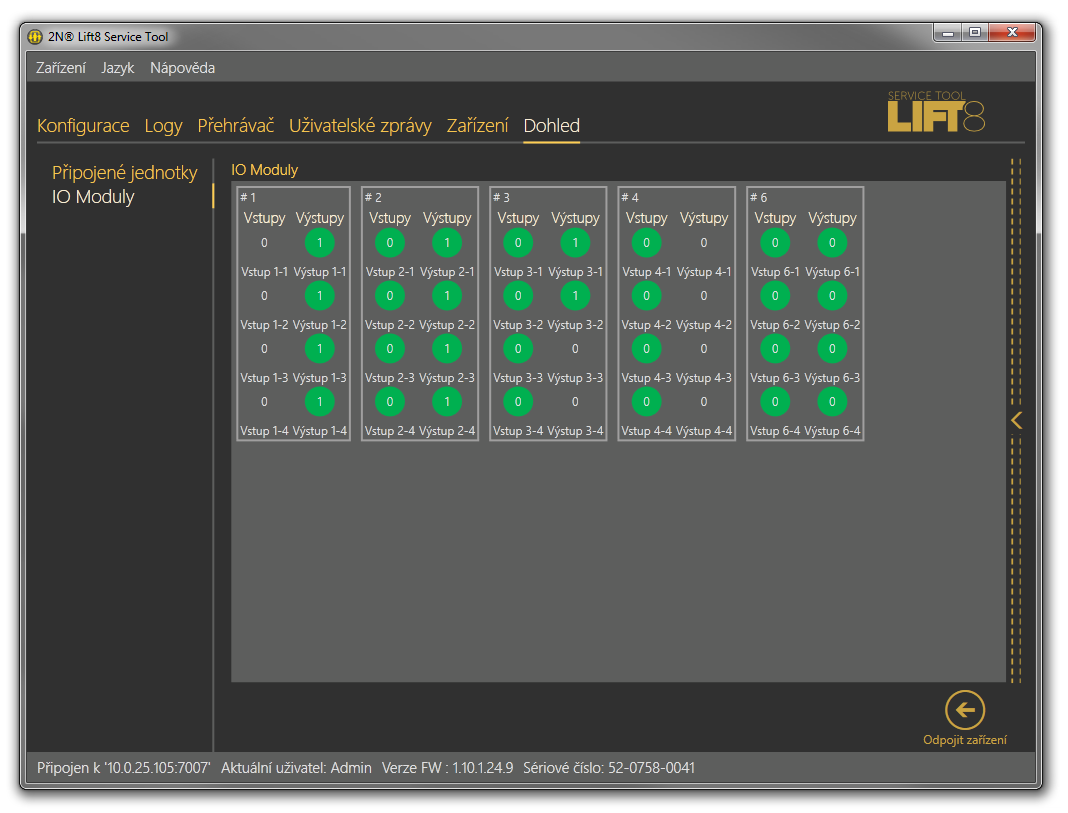 V každém zobrazeném IO modulu je k dispozici jeho číslo a přehled vstupů a výstupů. Každý zobrazený vstup může mít vlastní popis, který nastavíte v menu Konfigurace / IO Moduly. Je tak možné jednoduchým způsobem identifikovat, o jaký vstup nebo výstup se jedná. Ve stejném menu je možné také nastavit barvu aktivního a neaktivního stavu vstupu/výstupu. Vizuální identifikace stavu je tak ještě jednodušší. Logický stav, ve kterém se nachází daný objekt (vstup/výstup), je signalizován číselně (0/1) v barevném kroužku.