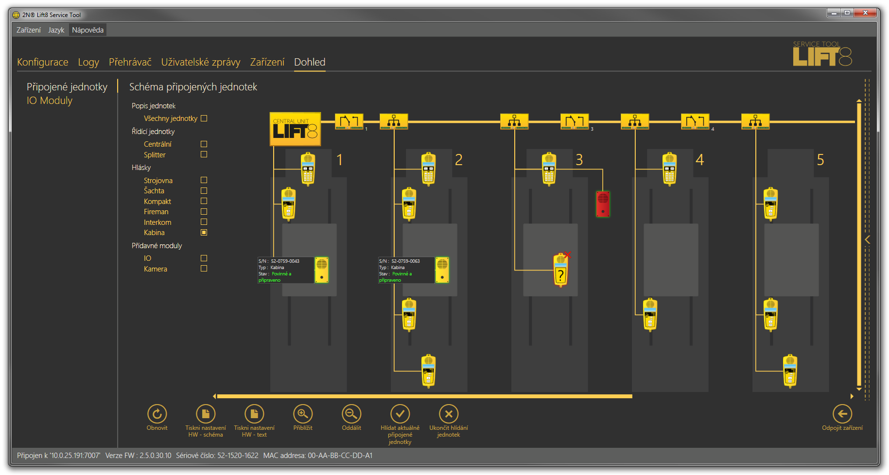 V menu je přístupný grafický přehled všech jednotek zapojených do systému 2N Lift8. V menu jsou dostupná následující ovládací tlačítka Obnovit, jeho stiskem se provede refresh zobrazené struktury. Tiskni nastavení HW (schéma nebo text). Tato tlačítka umožňují vytisknout schéma nebo textový popis všech hlásek a splitterů, které jsou připojeny k dané Centrální Jednotce. Schéma vytiskne stejný pohled, jako vidíte v aplikaci. Textový popis obsahuje stejné informace jako schéma. Jen není zobrazováno graficky ale v XML seznamu, ze kterého je obrázek generován. Po jejich stisku se provede export přímo na tiskárnu. Tlačítky Přiblížit a Oddálit se potom určuje míra zvětšení zobrazovaného schématu. Pokud chcete vidět strukturu celou, použijte oddálení. Ve chvíli, kdy potřebujete vidět detaily jednotlivých hlásek, zobrazení si přibližte. Ovládací tlačítka hlídání jednotek slouží pro zapnutí a vypnutí této funkce. Chování systému je stejné jako po zapnutí tlačítkem reset. Všechny hlídané jednotky jsou potom zeleně podbarveny a v případě ztráty spojení s některou z nich je vyhlášena a zobrazena chyba, viz obrázek níže.
