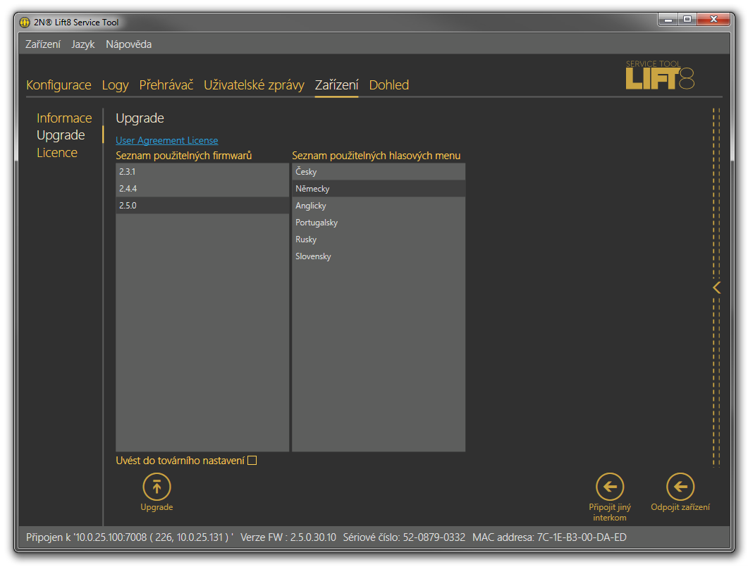 Vyberte si, který firmware chcete nahrát do centrální jednotky a jaké v ní chcete použít hlasové menu. Firmware i hlasové menu vyberete kliknutím na jeho název. Ten se označí a je připraven k nahrání. Pokud máte vybráno, stiskněte tlačítko Upgrade. 2N Lift8 Service Tool nahraje nový FW a Hlasové menu do centrální jednotky.