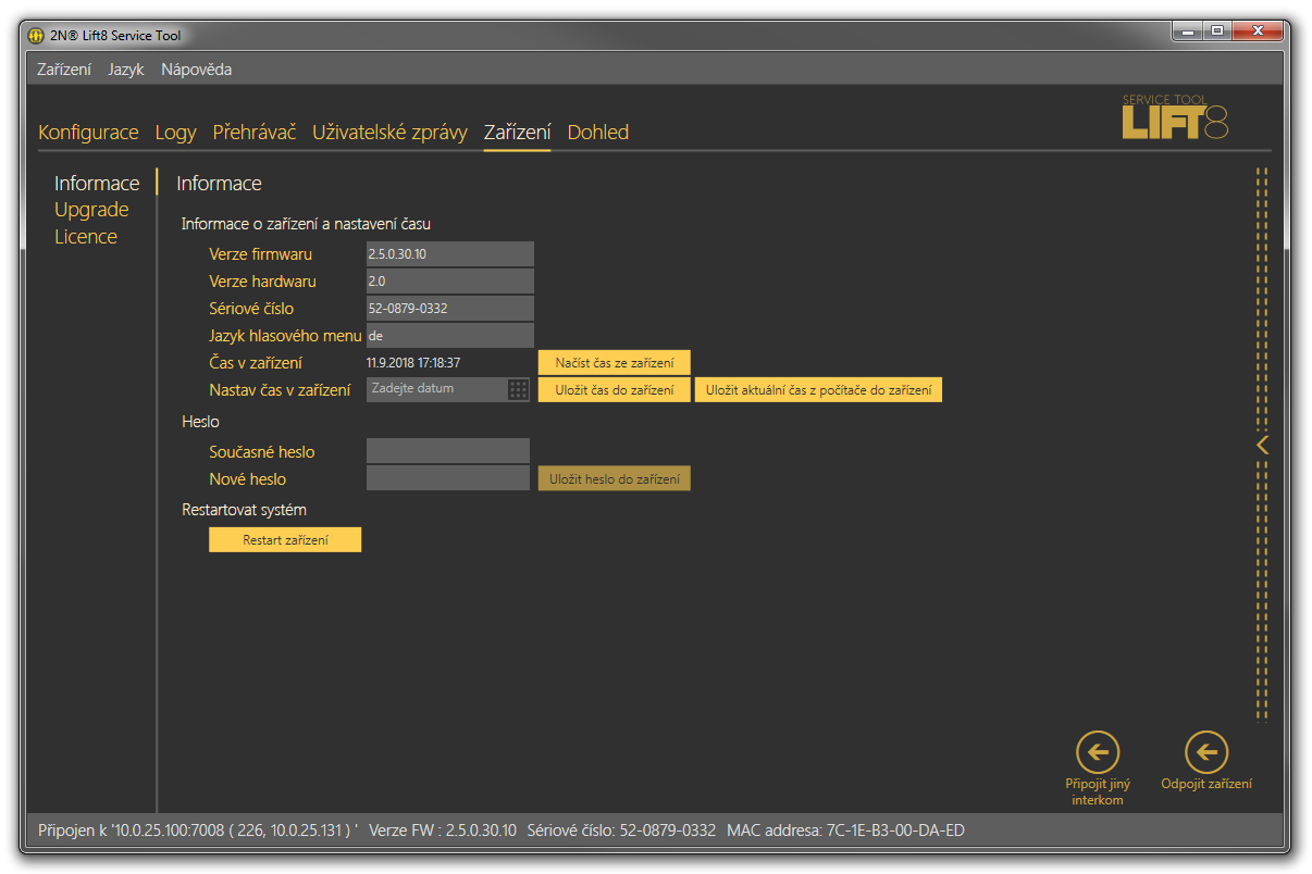 - Nově nastavené heslo je třeba změnit i v konfiguraci aplikace 2N Lift8 Service Tool. Aby bylo možné se příště opět připojit.