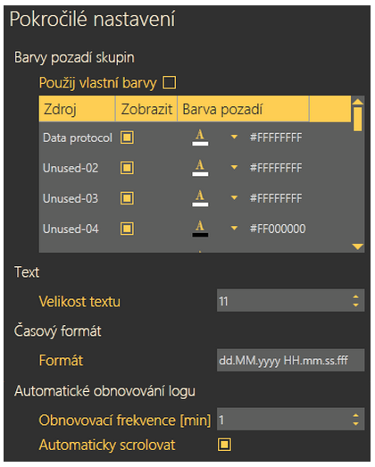 Pokročilé nastavení logů je zobrazováno ve skrývatelném formuláři na pravé straně okna. Jako první je tabulka umožňující nastavení vlastní barvy pozadí vybraných zpráv. Zaškrtávátko Použít vlastní barvy aktivuje uživatelské nastavení barev pozadí jednotlivých skupin logů, které se nacházejí níže v menu. Po zaškrtnutí se změna ihned projeví. Je zde také možné nastavit si vlastní seřazení informací o datu a čase. Můžete využívat nativní systémové řazení data a času nebo si nastavit vlastní pořadí. Parametr nemusí obsahovat všechny údaje dd.MM.yyyy HH.mm.ss.fff. Jejich pořadí a seřazení je ale čistě na vás. Je třeba se pouze řídit obecnými pravidly pro Custom Date and Time Format Strings. Jejich vysvětlení můžete nalézt například zde. V části Text je možné upravit velikost zobrazovaného písma. Poslední možností rozšířeného nastavení je automatické obnovování logu. V parametru nastavte obnovovací frekvenci v minutách, a zda si přejete automaticky posunovat zobrazení tak, aby byl vždy viditelný poslední (nejnovější) řádek logu. Tuto funkci povolujete posledním zaškrtávátkem pod hlavní tabulkou, jak již bylo uvedeno výše.