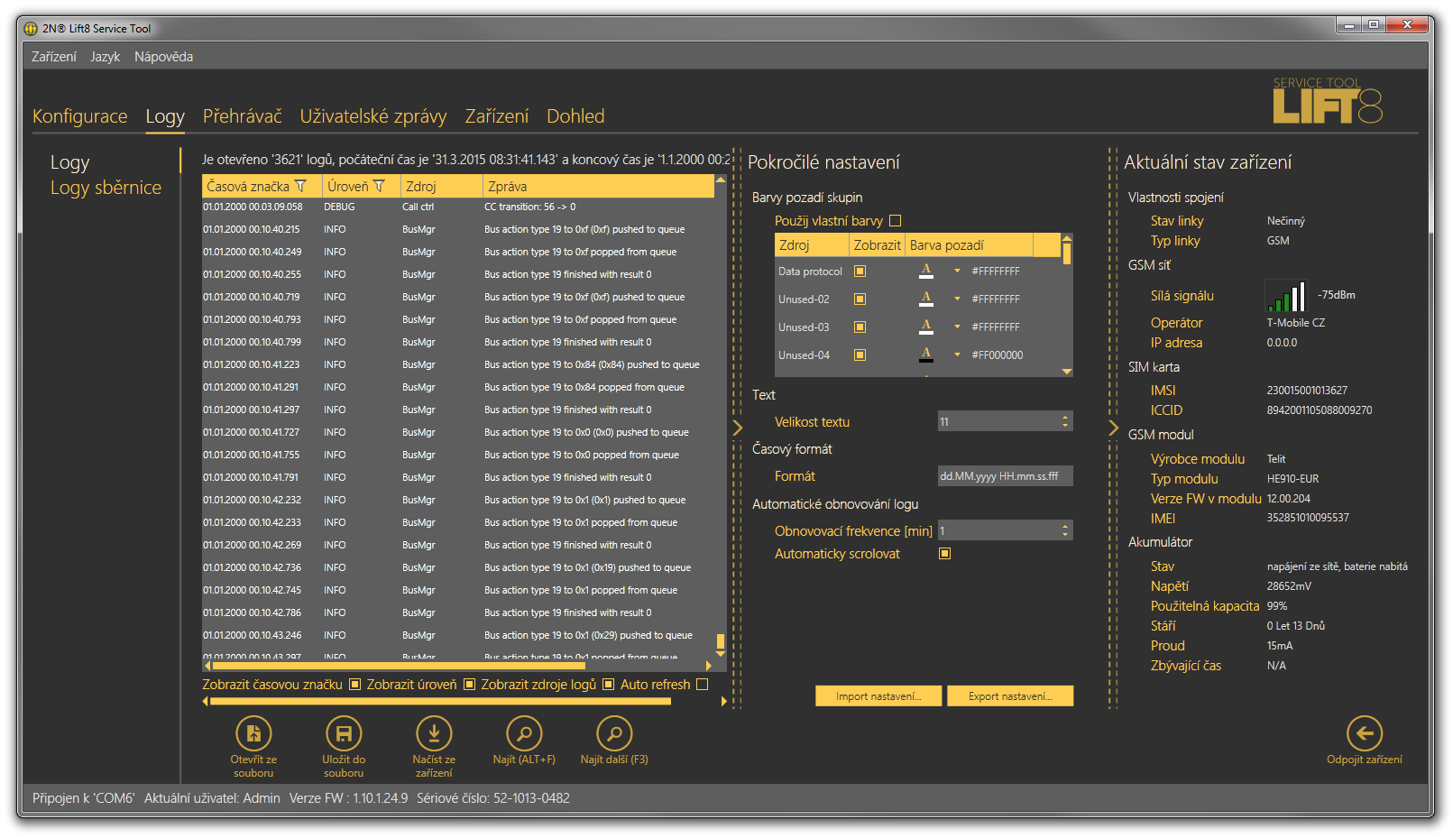 Sekce logy nabízí možnost prohlížení diagnostických zpráv, které byly zaznamenány do logovacích souborů. Po spuštění aplikace nejsou zobrazeny žádné logy. Ty je třeba nejprve nahrát ze souboru nebo po připojení k Centrální jednotce, stáhnout aktuální logy z ní.
