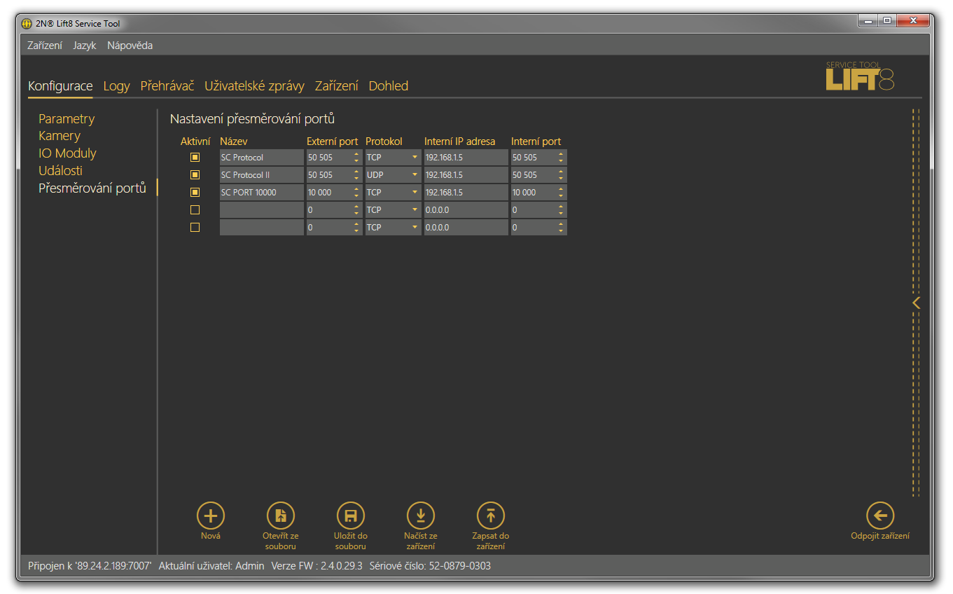 - 7008 – nativní komunikační port pro Lift8 Server. Ten se může změnit jeho korektní nastavení naleznete v parametru 1232.