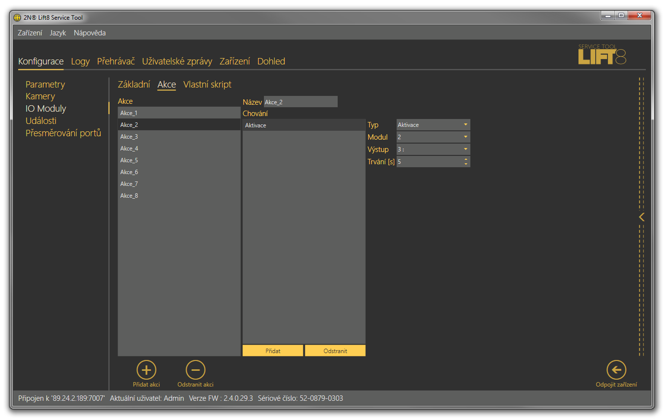 Menu IO Moduly – Akce