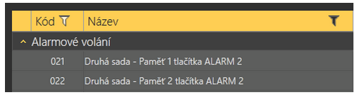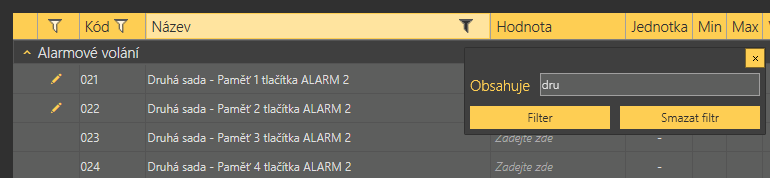 V menu také naleznete tlačítka Rozbalit a Sbalit skupiny. Ta slouží pro rychlé rozbalení jednotlivých sekcí a zobrazení všech parametrů. Vedle nich je umístěno tlačítko Oblíbené. Jeho stiskem se v tabulce zobrazí pouze položky označené jako oblíbené. Novou oblíbenou položku zvolíte kliknutím na symbol hvězdy ve sloupci oblíbené za každým parametrem. Kliknutím na hvězdu se tato vyplní a je oblíbenou položkou. Odeberete ji obdobně. Symbol hvězdy bez výplně pak není oblíbenou položkou. Rozbalování a sbalování skupin funguje i na pohled oblíbených položek. Stejně tak filtrace. To, že jsou aktivní pouze oblíbené položky je signalizováno změnou barvy tlačítka Oblíbené ze žluté na oranžovou. Stisknutím tlačítka Nová sada se aktuální nastavení přepíše defaultními hodnotami. Chcete-li zálohovat data na disk počítače, použijte tlačítko Uložit do souboru. Tlačítko Otevřít ze souboru potom slouží k načtení takto vytvořené zálohy. Stisknutím Načíst ze zařízení dojde k vyčtení aktuální sady parametrů z Centrální jednotky. Po ukončení úprav stiskněte Zapsat konfiguraci do zařízení. Tím se změny uloží do paměti centrální jednotky. K nalezení potřebných údajů a parametrů je možné využít filtrace. Filtr se nastavuje v každém sloupci zvlášť a jejich kombinací tak můžete rychle nalézt požadovaná data. Filtr aktivujete kliknutím na obrázek násypky v každém sloupci. Aktivní filtr ve sloupci je indikován změnou barvy násypky. Viz obrázek níže.