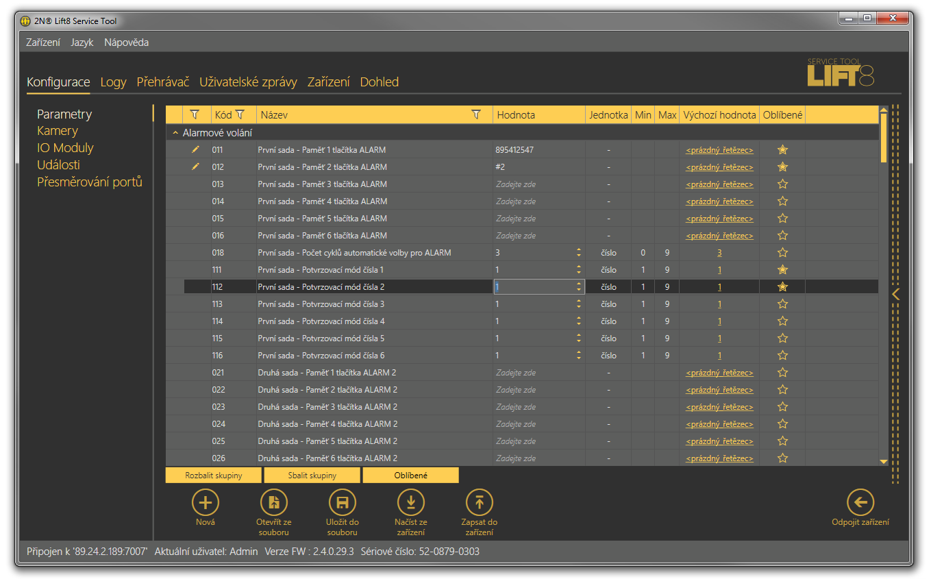 Po přihlášení k centrální jednotce, které je popsáno v předchozí kapitole, se dostanete do hlavní konfigurace. Menu Parametry / Základní, ve kterém je znázorněna tabulka parametrů. Zde je veškeré nastavení systému 2N Lift8. Každý parametr má svůj kód zobrazený v tabulce. Seznam všech parametrů a jejich význam naleznete v 3.3 Tabulka parametrů.