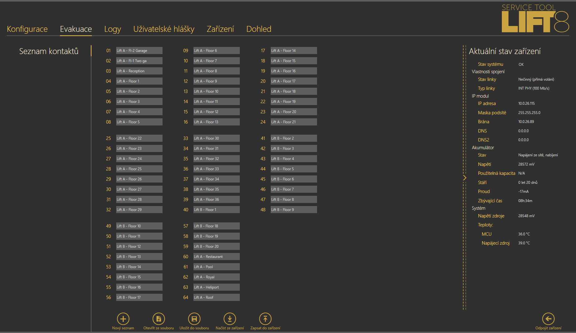 - Načíst ze zařízení – načte aktuální seznam kontaktů nahraný v centrální jednotce Lift8, podle které je systém řízen.