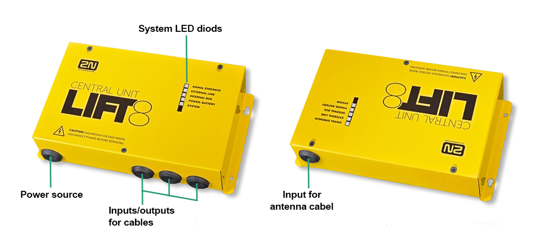 Audio unit for the machine room/control center. Contains a receiver (optional) and a keypad for easy control. Makes it possible to communicate with the other system audio units and configure the CU without a PC. Equipped with an external siren connector. Can be shared by multiple elevators (shafts). Robust yellow cover.