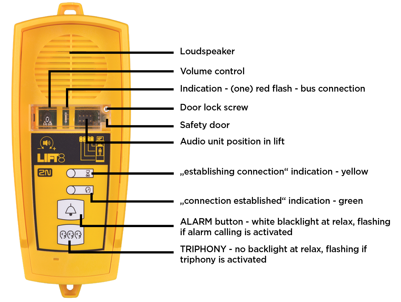 This audio unit is designed for installation on the lift shaft bottom or lift cabin roof, or wherever it is necessary to communicate (during lift maintenance, e.g.). The audio unit is enclosed in a robust yellow cover. It is not intended for outdoor use but perfectly tolerates the conditions in lift shafts: is resistant against fall of small objects, dripping oil, etc. The ALARM button activates the control centre connection, the TRIPHONY bottom enables conference connection with the other audio units of one and the same lift. The audio unit contains a built-in microphone and a speaker. A handset can be connected for better acoustic properties. Thanks to its size and robustness, the audio unit has a very good, strong sound.